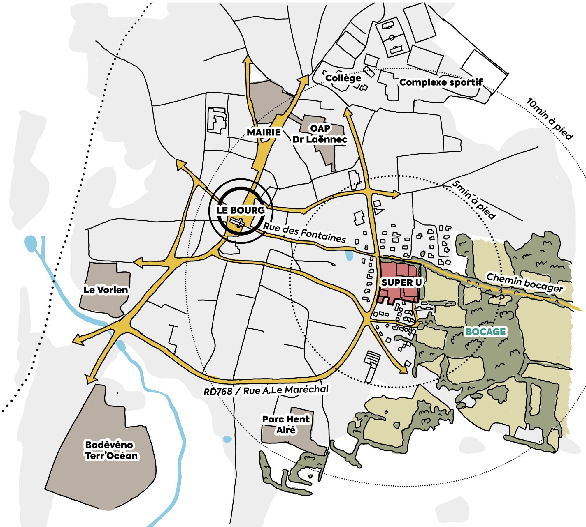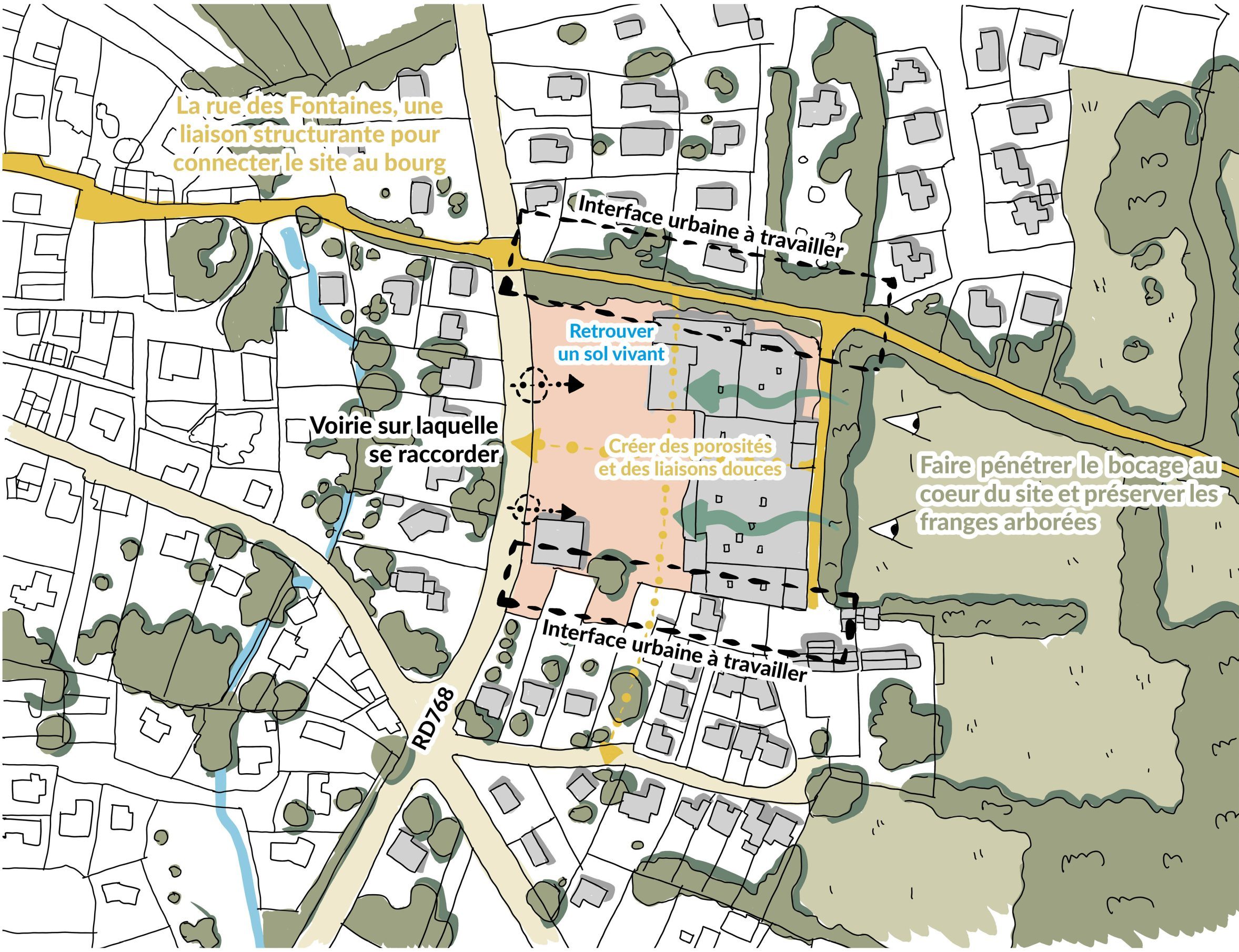 > Rationalisation des voies d’accès au minimum et constitution d’un réseau de cheminements doux connectés aux chemins existants