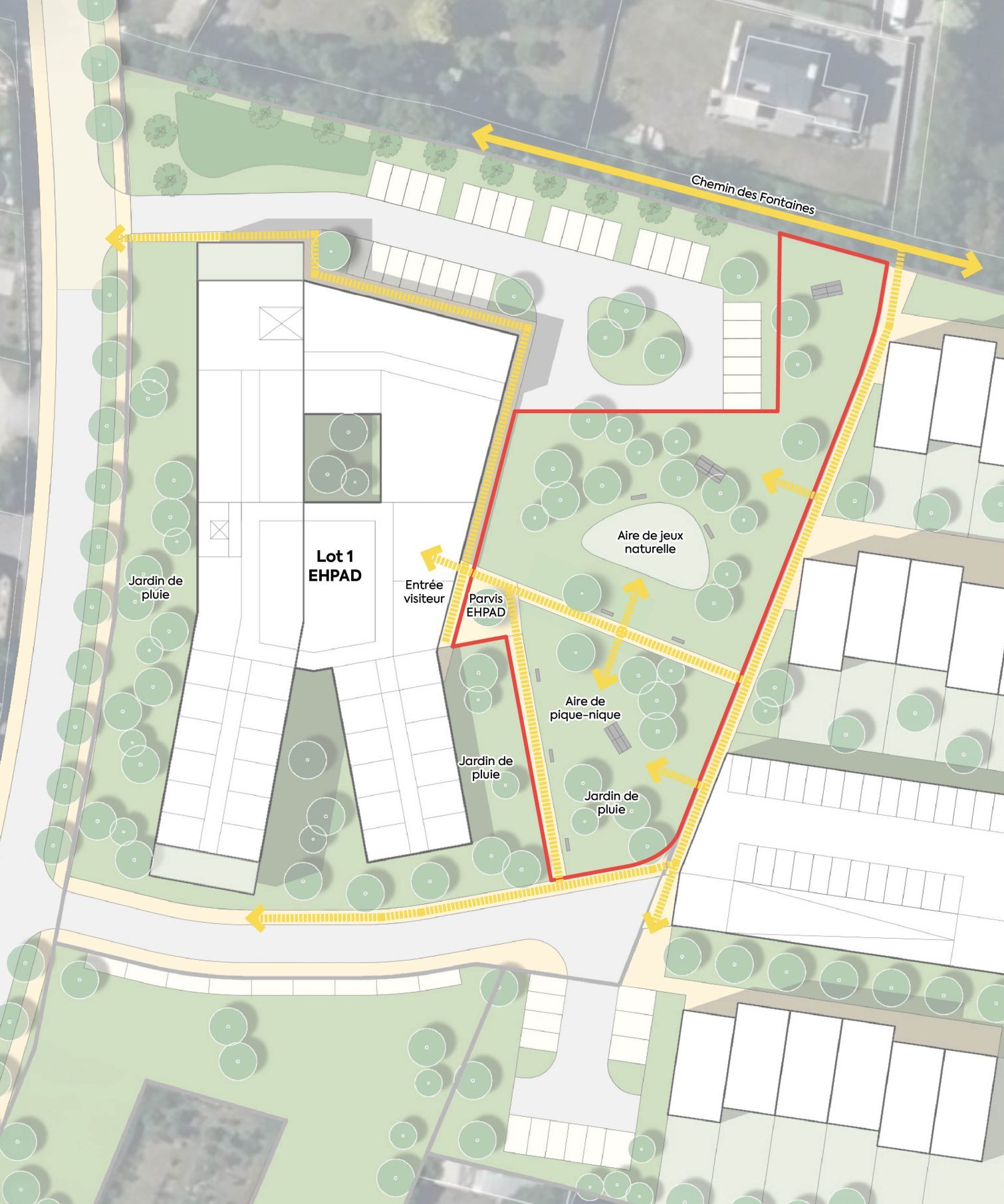 > Aménagement du coeur d’ilot en parc public paysager, accessibles aux résidents de l’EHPAD et aux habitants, qui propose de nouveaux usages et une rétention des eaux pluviales. Un espace de rencontre intergénérationnel pour le quartier.