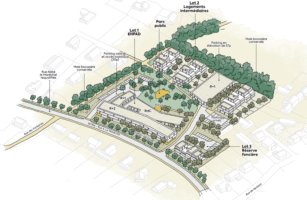 > Implantation du nouvel EHPAD compact (R+2 / 80 lits) en front de voie pour structurer la rue Abbé le Maréchal.